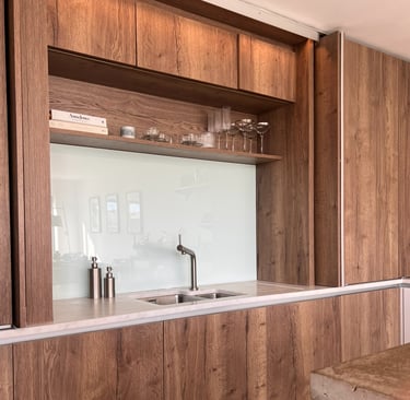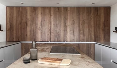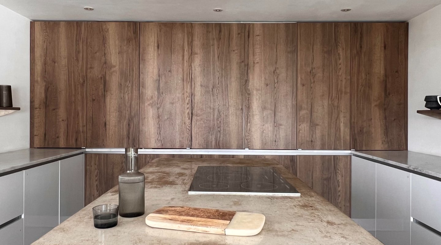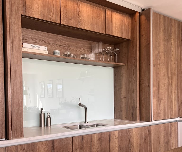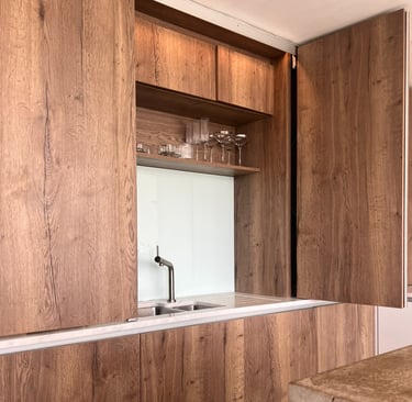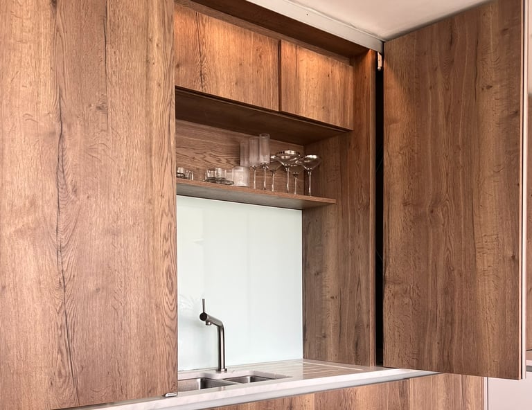 Bifold doors above worktop level allow the sink area to be covered, leaving a clean wall of cabinetry within the open plan space.
